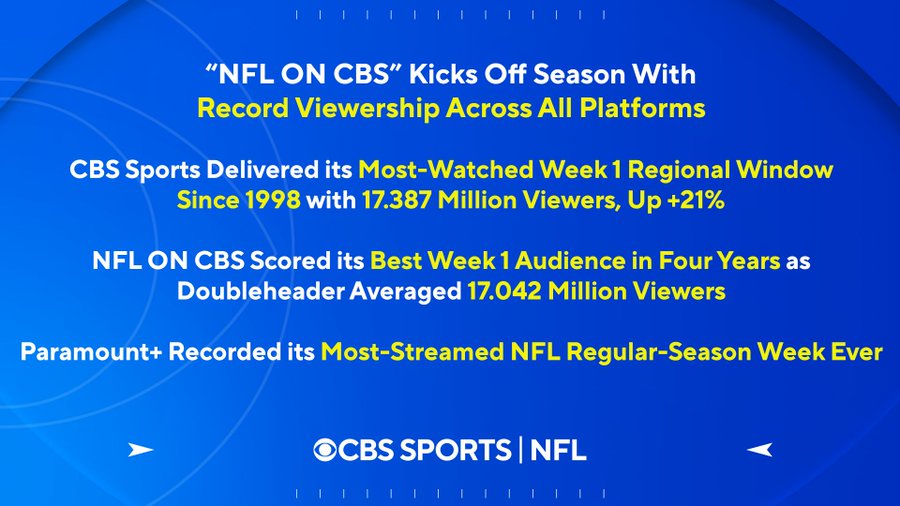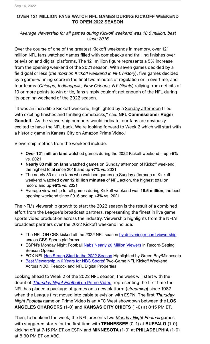 The 2021 NFL season kicks off on Thursday night when the defending champion Bucs meet the Cowboys 820 pm. 174 million viewers -- up 7 YoY 2nd-highest Week 1 viewership over last 5 years. The week one slate of games averaged better than 18 million viewers.